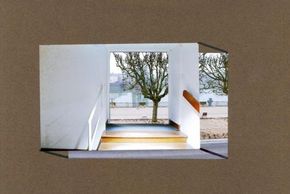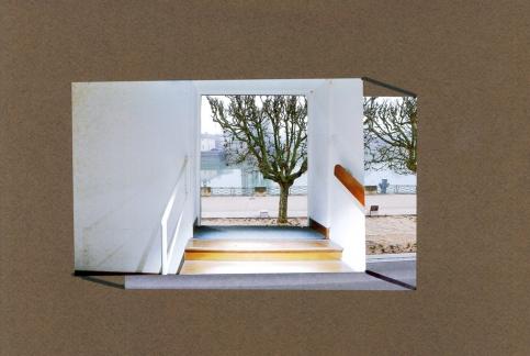 A l’aide d’un montage de deux photographies, l’une d’une ouverture, l’autre d’un lieu, réalise une composition géométrique qui mêle la vision de deux espaces.